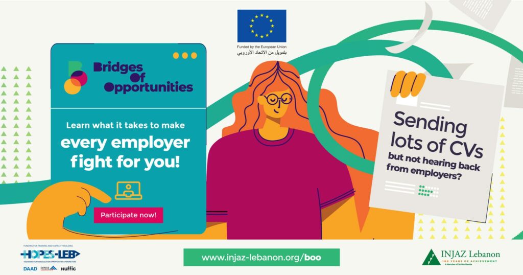 إنَّ مشروع “Bridges Of Opportunities (BOO)” من مؤسسة إنجاز لبنان هو المشروع المناسب لتعلّم مهارات التوظيف والاندماج في سوق العمل. ستُعرض عليك سلسلة من ورش العمل والفعاليات عبر الإنترنت التي ستزودك، كطالب جامعي أو خرّيج جديد، بالمعرفة والمهارات المهنية التي تحتاجها للحصول على الوظيفة المطلوبة والنجاح فيها. ستحصل أيضًا على فرصة للمشاركة في معرض افتراضي للوظائف، والتواصل مع مهنيين وأصحاب العمل المحتملين فضلًا عن فرصة اكتساب خبرة تدريب عن بُعد.